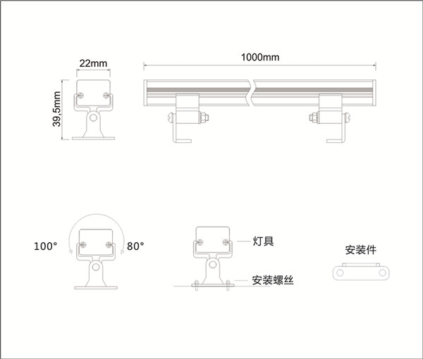 材 质:灯体-6063铝合金挤出成型;安装组件-支架6063铝合金冲压成型,6063铝合金螺栓紧固;端盖-阻燃PC注塑成型;